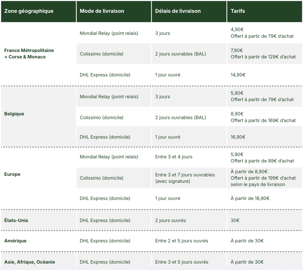 Les délais de livraison sont fournis à titre indicatif et correspondent aux délais moyens observés. Ils peuvent varier en fonction des périodes de forte affluence ou d’événements externes. Merci de votre compréhension.